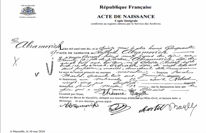 Allumez une bougie Allumer une bougie pour Raphael ABRAMOVITCH Ville de naissance : 13 MARSEILLE Ville de résidence : 75 PARIS 18 Déporté à 34 ans Arrestation : 93 DRANCY Raphaël ABRAMOVICH (1910-1944) Ce travail a été réalisé durant l’année 2023-24 par des élèves de 3e 4 et 5 du collège Les Blés d’Or, à Bailly-Romainvilliers en France, encadrés par leurs professeurs Mme Jorrion, professeur de français, et Mme Garilliere, professeur d’histoire-géographie. Nous faisons partie du projet Convoi 77. Cette association a pour objet de regrouper autour des... Lire sa biographie 1 X Allumer une nouvelle bougie pour Raphael ABRAMOVITCH Choisir un autre déporté (au hasard) Choisir un déporté spécifique Choisir tous les déportés